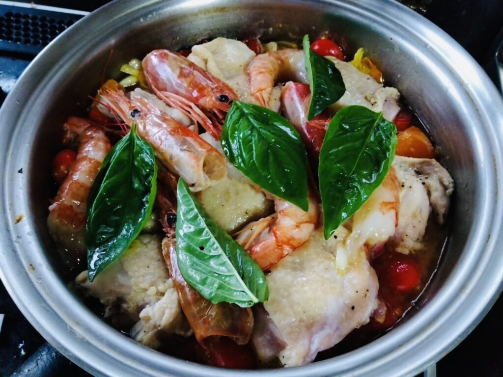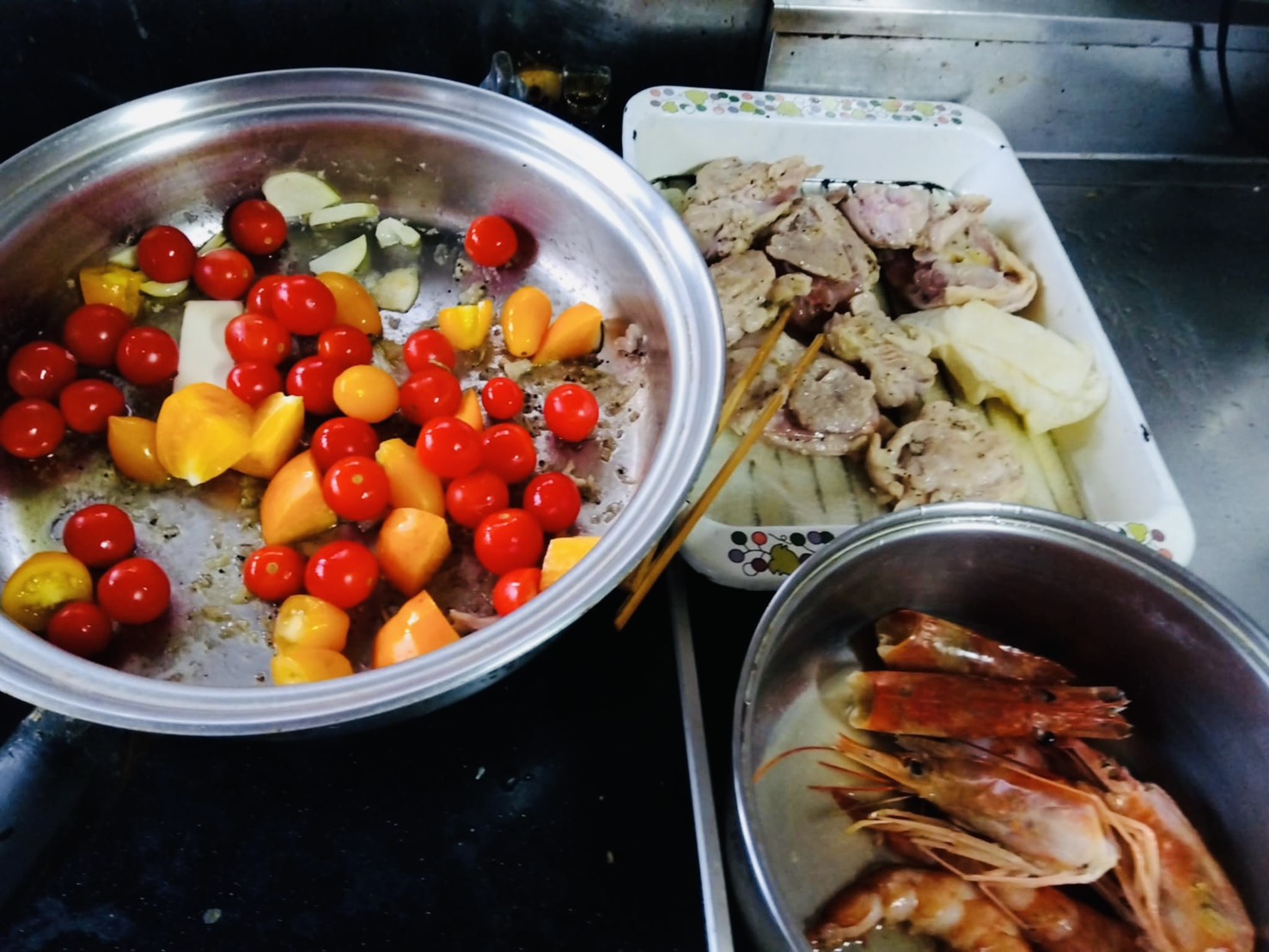 Home ブログ, 新着情報 トマトの赤ワイン煮をつくってみました。 トマトの赤ワイン煮をつくってみました。 2025.10.8 ブログ、新着情報 トマトの木を倒しました。 今年の夏は高温障害でトマトが不作で、ようやく涼しくなってきたころようやくまともに実を付けました。 最後に収穫したトマトと、鶏肉と赤エビに、最後にバジルを摘んで入れ、オリーブ油とニンニクで香り付けをしてから赤ワインで煮込み、塩コショウで味を調えます。 バジルを入れると一気にイタリア~ン!になります。 Post Share Hatena Pocket RSS feedly Pin it コメントは利用できません。